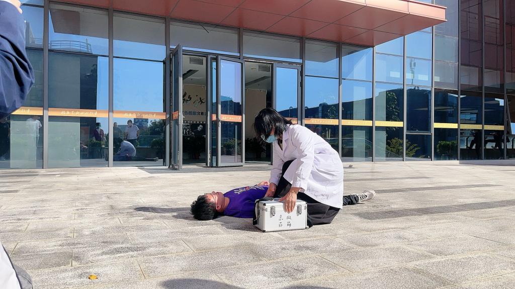在人员疏散的同时,模拟的应急救援程序同步展开。学校保卫处接到“火情”报告后,迅速调集义务消防队员赶赴现场,模拟进行初期火灾扑救与控制。身着专业防护服的消防人员携带装备迅速进入大楼,展开搜救与灭火作业。与此同时,模拟的医疗救护组也迅速到位,对“受伤”人员进行现场检伤、包扎并演示了紧急转运流程,展现了完整的应急响应链条。
