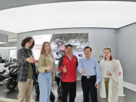 最后一站师生走进台铃科技有限公司,在企业工程师的陪同下,俄罗斯交换生参观了国家级实验室智能化生产线及新能源产品展厅,深度了解从研发设计到规模化生产的全链条流程。值得关注的是龙华镇已形成以台铃小刀为核心的电动车产业生态圈吸引超20家配套企业落户该镇。2023年电动车产业产值占全镇规上工业总产值的43%。这种"龙头引领+链式集聚" 的发展模式正是龙华镇践行"制造业当家"战略的生动注脚。